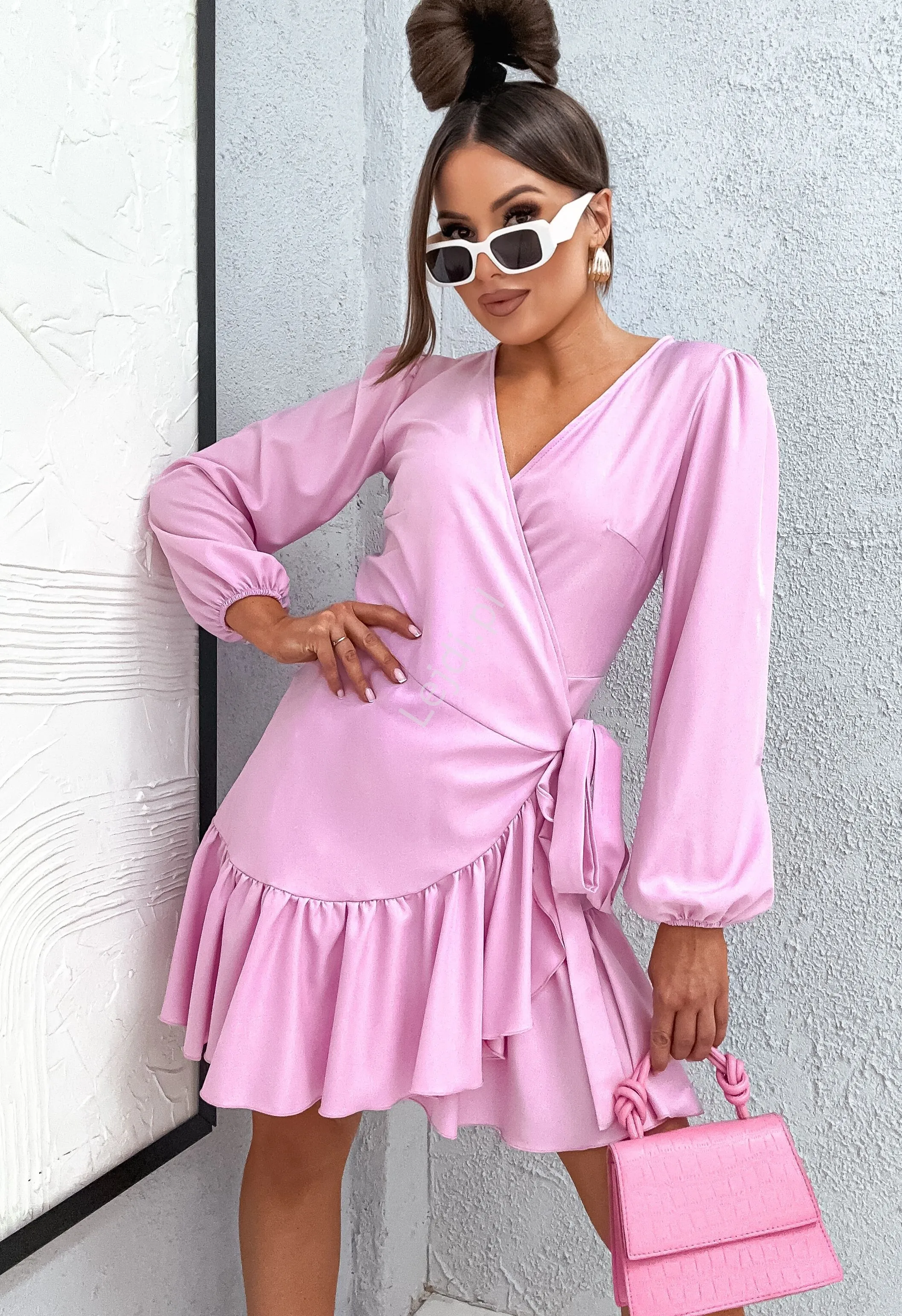 448-2 YUNA Plisowana sukienka midi z dekoltem i paskiem – RÓŻE na tle ecru