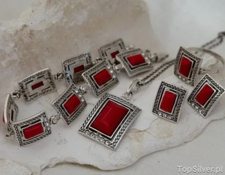 W inspirowane motywami roślinnymi srebrne oprawki, zakute zostały turkusy. W skład takiego zestawu wchodzą: bransoletka, kolczyki, wisior oraz pierścionek. Wymiary pojedyńczego ogniwa to: 11mm x 13mm Wymiar kamienia to: 6 x 8mm Srebro próby 925. Szukasz stylowego pomysłu na prezent dla osoby lubiącej turkusy? Naszym zdaniem to jest idealny zestaw srebrnej biżuterii na prezent.