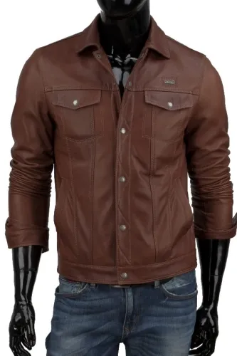 KTM122 - Brązowa kurtka skórzana w stylu katany jeansowej DORJAN