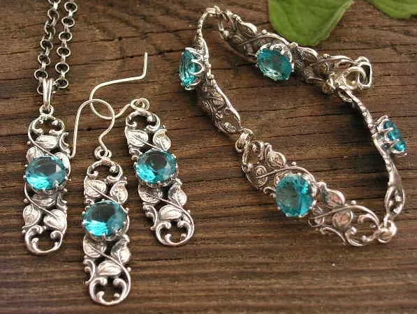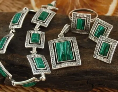 W inspirowane motywami roślinnymi srebrne oprawki, zakute zostały krzemienie pasiaste. W skład takiego zestawu wchodzą: bransoletka, kolczyki, wisior oraz pierścionek. Uwaga prążki na kamieniu mogą się różnić od tych ze zdjęcia. Wymiary pojedyńczego ogniwa to: 13mm x 11mm Wymiar kamienia to: 8mm x 10mm Srebro próby 925.