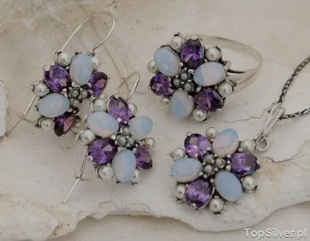 PAWIE OKO - srebrny komplet perły ametysty opale