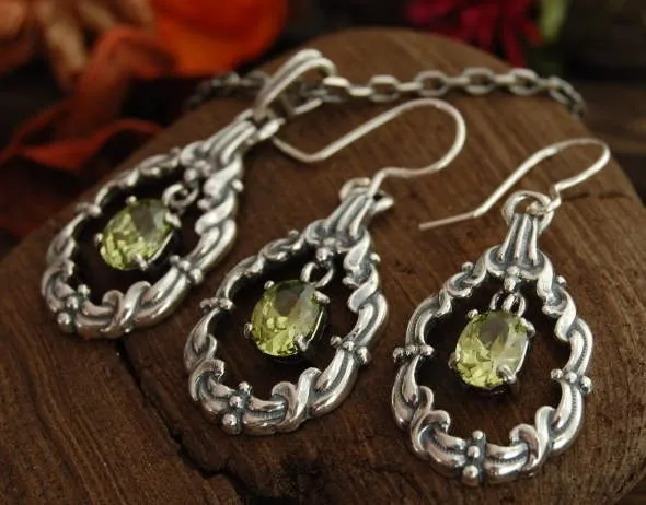 Niezwykle gustowny komplet – kolczyki i wisior inspirowany formami roślinnymi, charakterystycznymi dla okresu secesji. W srebrnej oprawie wkomponowane zakute w srebrną ramkę rubiny (wymiary kamienia 6x8mm). Biżuteria wykonana została z dbałością o każdy szczegół – kolczyki i wisiorek po prostu zwracają na siebię uwagę. Sama się przekonaj. Długość kolczyka z zapięciem to 4,2cm Szerokość kolczyka to 1,8cm. Zapięcie na otwartych biglach Srebro próby 925 W naszej ofercie znajdziesz także ten sam model z innymi kamieniami.