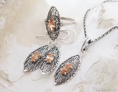Wytworny, srebrny zestaw biżuterii w składzie: bransoletka, kolczyki, wisiorek oraz pierścionek – stylistyką nawiązujące do najpiękniejszego okresu dla jubilerstwa czyli secesji. W misterny a zarazem delikatny wzór wkomponowano piękne kryształki Swarovskiego. Biżuteria wykonana została z dbałością o każdy szczegół. Biżuteria z pewnością będzie przykuwać uwagę i sprawi, iż każdy poczuję się w niej piękniejszy 🙂 Wymiar pojedyńczego motywu zdobniczego: 11x22mm długość bransoletki to 19,5cm Srebro: 925 W naszej ofercie znajdziesz także te elementy do kupienia osobno. To świetny pomysł na prezent.