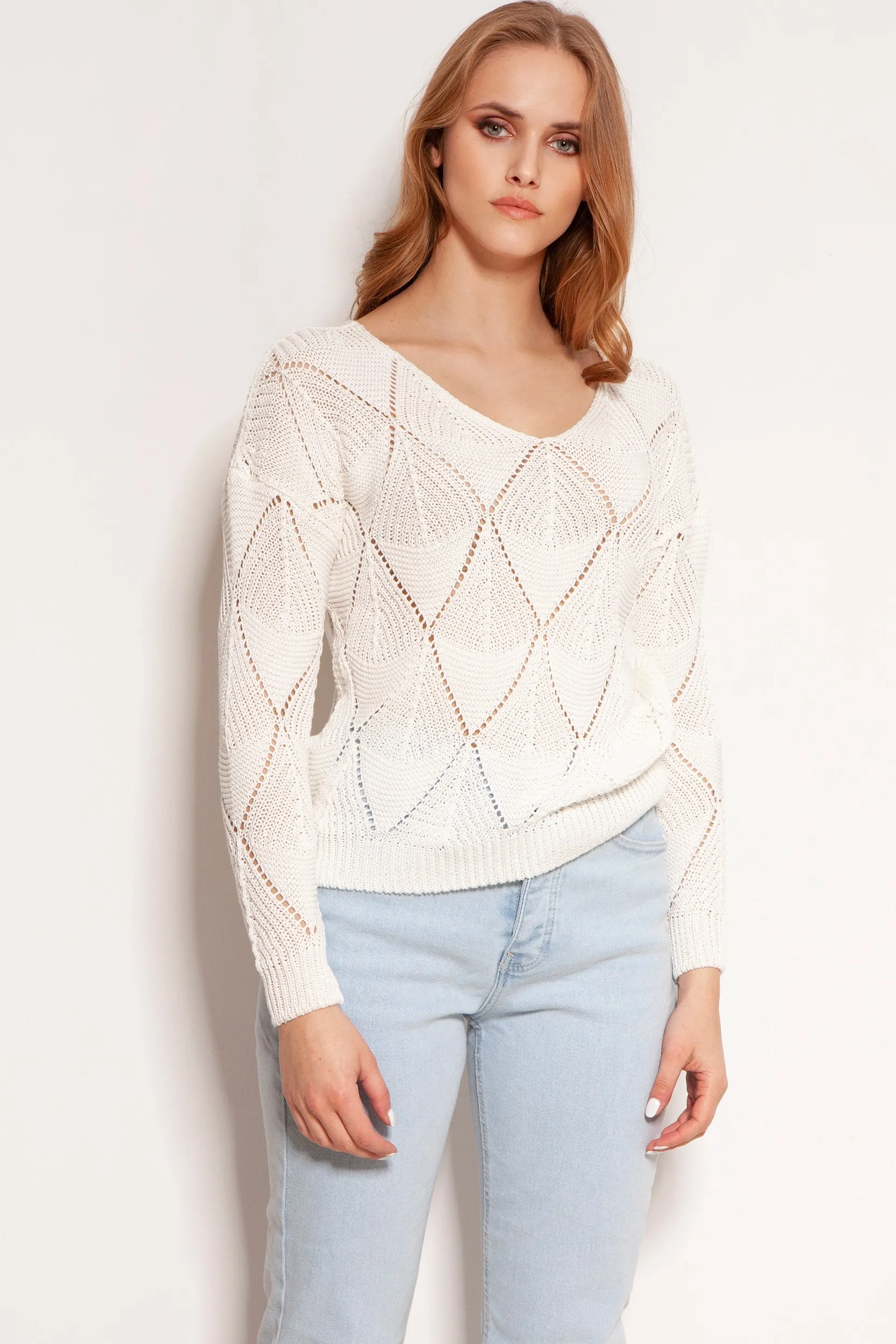 Ażurowy Sweter z Głębokim Dekoltem V - Ecru