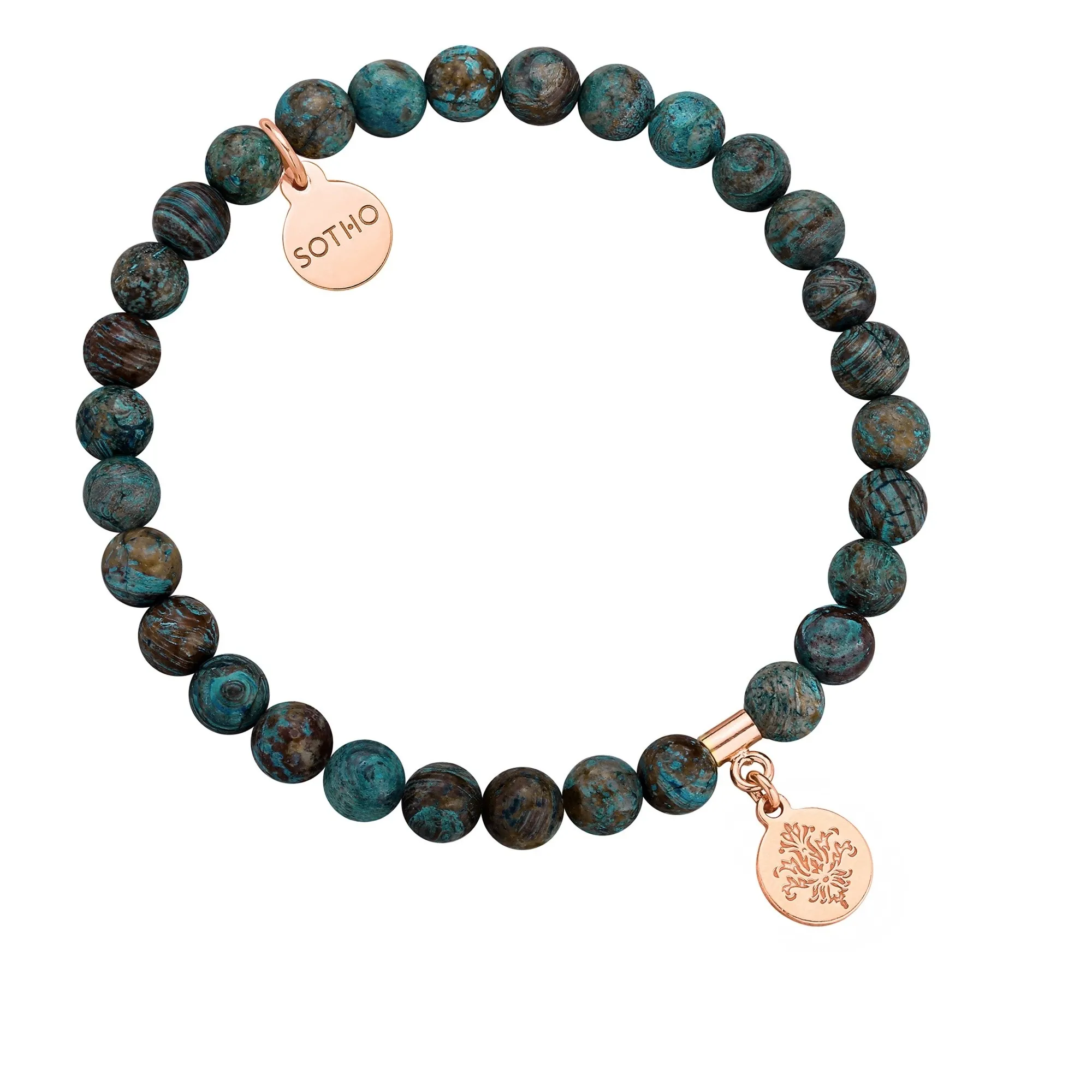 Bransoletka wykonana z turkusowo-brązowego jaspisu, rozetki i zawieszki z logo marki. Wszystkie elementy wykonane ze srebra 925.