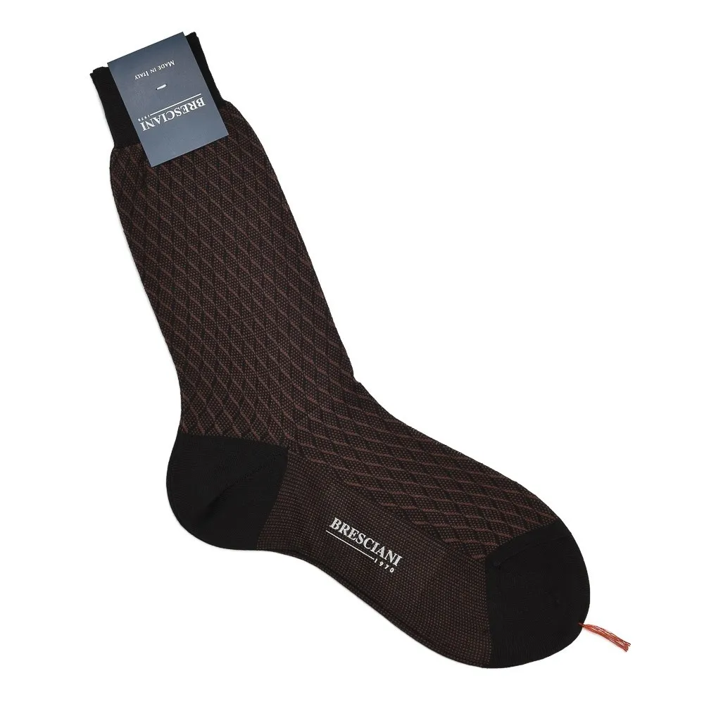 Skarpetki męskie Bresciani w brązowy i czarny wzór. Skarpetki Bresciani są wykonane z najlepszej dostępnej egipskiej bawełny Mako. Bawełna jest lekka i idealna od wiosny do jesieni i dla osób, które nie lubią przegrzewać stóp. Część palcowa ze stopą są ręcznie łączone aby idealnie pasowały do stopy i wyjątkowo komfortowo się nosiły. Skarpetki wykonane są w 100% z egipskiej bawełny. Przy wyborze rozmiaru warto wybrać skarpetki o 1 rozmiar mniejsze.