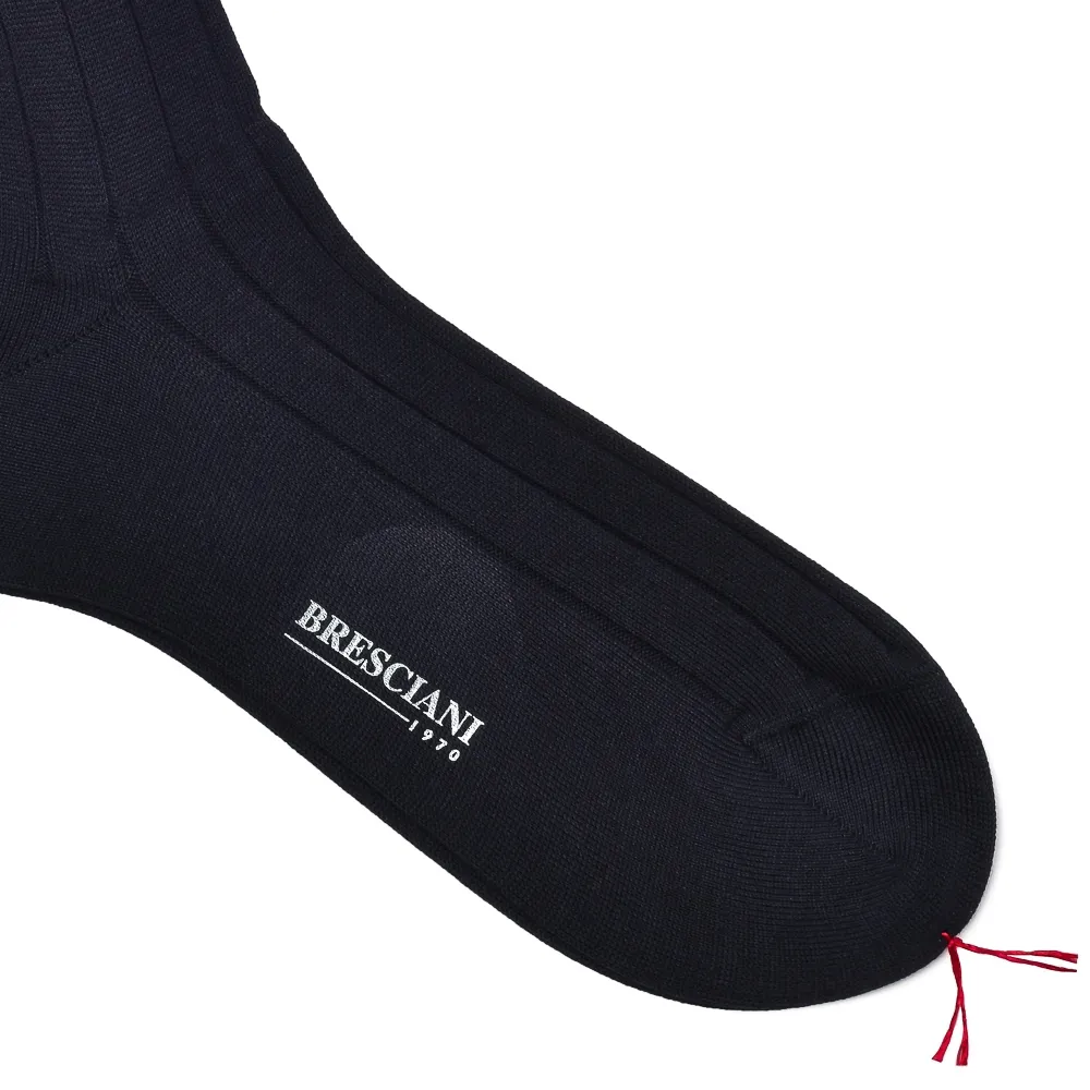 Granatowe skarpetki Bresciani w jodełkę. Skarpety Bresciani są wykonane z najlepszej dostępnej egipskiej bawełny Mako. Część palcowa ze stopą są ręcznie łączone aby idealnie pasowały do stopy i wyjątkowo komfortowo się nosiły. Szczegóły dotyczące rozmiarów są w zakładce „Dopasowanie i wymiary” Bawełna 100% Made in Italy