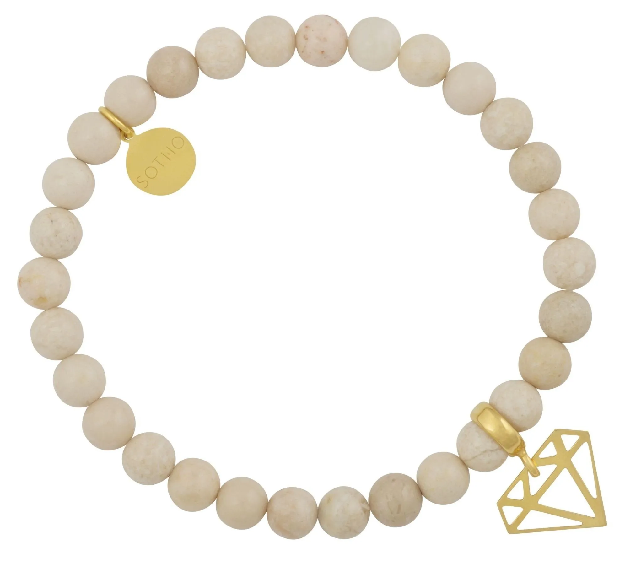 Beżowa bransoletka z kamienia rzecznego, przekładki z koniczynką i zawieszki z logo marki. Na zawieszce można grawerować. Wszystkie elementy wykonane ze srebra 925 powlekanego 24 karatowym złotem. Długość 18 cm. Kamień 8 mm. Koniczyna 18 mm. Zawieszka z logo 10 mm.