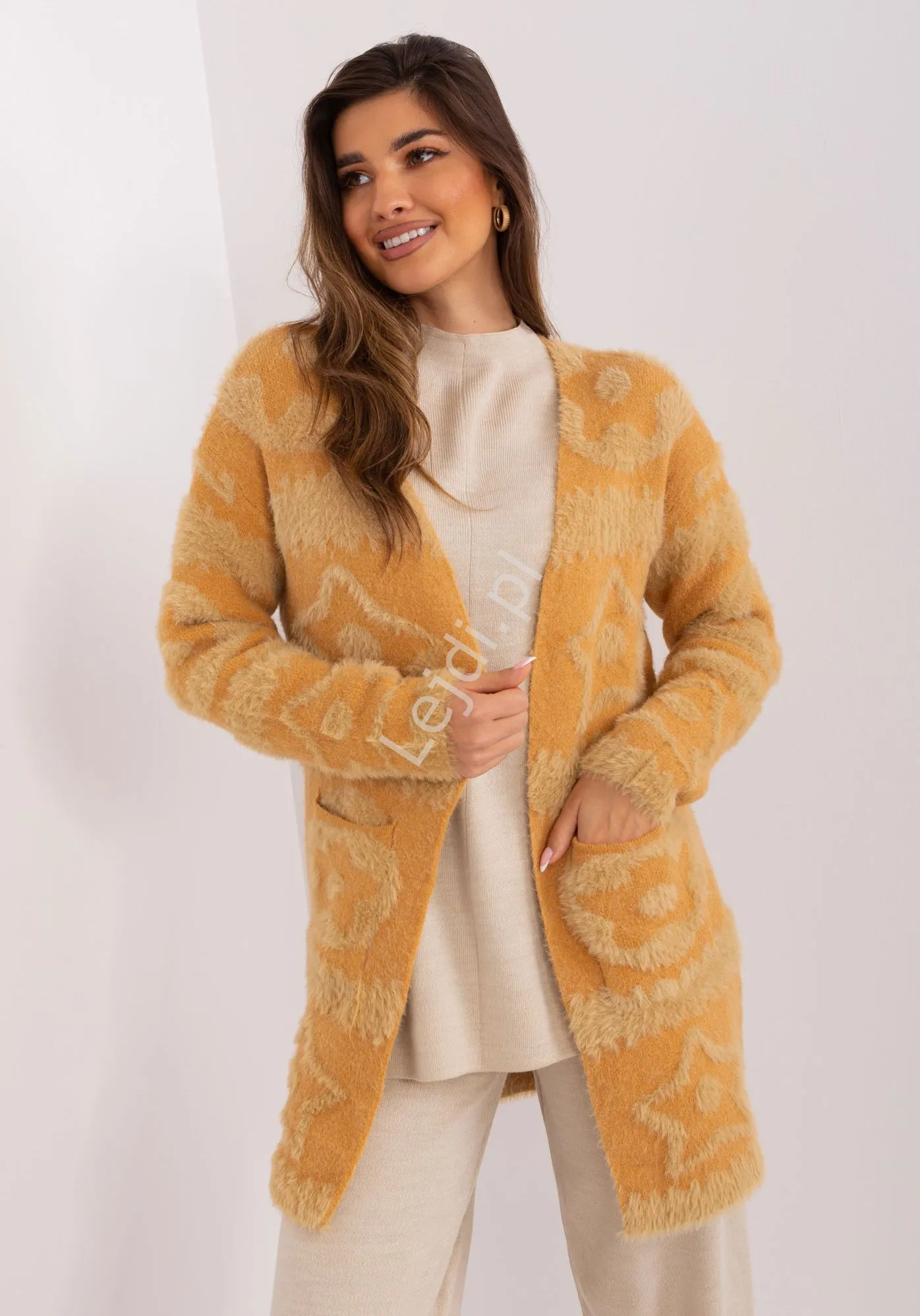 Musztardowo camelowa narzutka w kwiatki , kardigan ze wzorem ala LV 234503