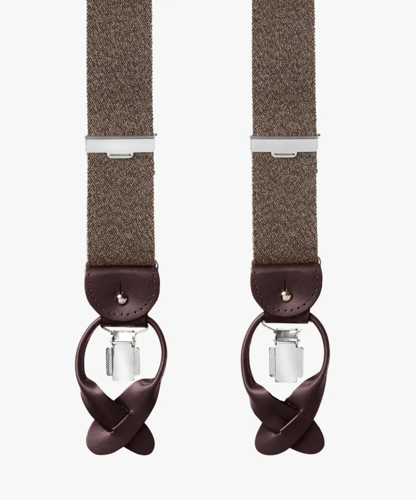 Męskie szelki do spodni, brązowe z ciemnobrązowym zapięciem na guziki lub klipsy