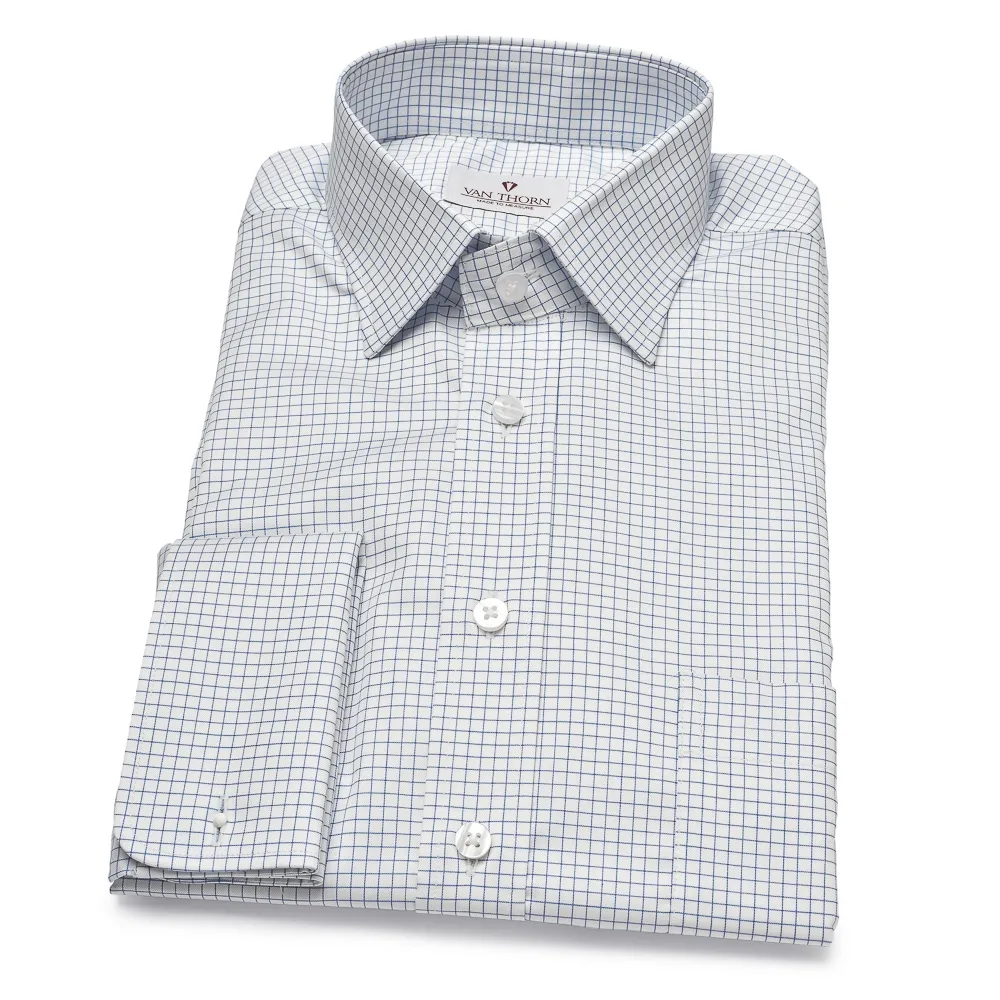 Biała koszula VAN THORN w niebieską kratę z kołnierzykiem półwłoskim w ciekawy i bezpieczny urozmaici każdą stylizację. Charakterystyczny skośny wzór wynikający ze splotu tkaniny w unikatowy sposób łączy się z niewielką kratą. Półwłoski kołnierz z kolei pozwana nie tylko na dopasowania krawata, ale także muchy. Biała koszula VAN THORN w niebieską kratę wykonana z najwyższej jakości 100% bawełny spełni oczekiwania nawet najbardziej wymagających klientów. Klientom zamawiającym koszule VAN THORN dajemy możliwość zamiany rozmiarów, mankietów, kołnierzy i guzików w cenie.