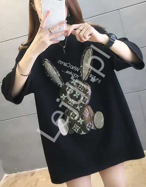 Biała koszulka z kryształkowym króliczkiem i napisem Who Cares. Koszulka wykonana z mięciutkiej elastycznej tkaniny ala flanela. Doskonała do noszenia na co dzień. Pięknie leży i bardzo ładnie układa się na ciele. T shirt damski.