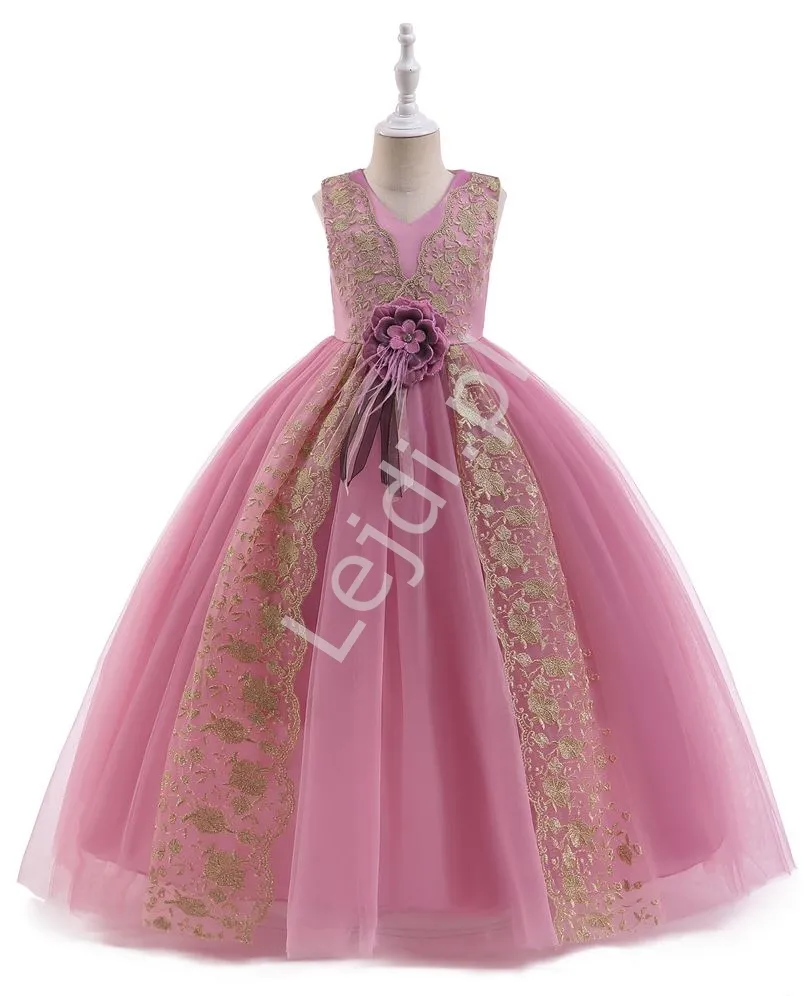 Tiulowa pustynno różowa długa suknia dla dziewczynki ze złotymi haftami 283