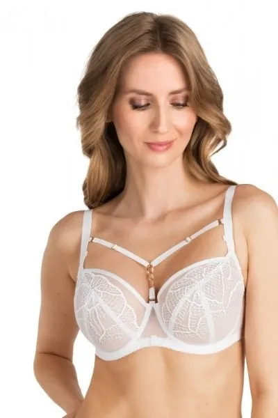 Biustonosz typu soft, na fiszbinach- zapewnia efekt mocnego uniesienia i zebrania biustu do środka- miseczki pełne, zdobione haftem, podszyte dodatkowo siateczką- na dekolcie odpinane, regulowane paseczki- ramiączka nieodpinane, regulowane- obwód z boczną fiszbiną, zapobiegają zwijaniu się obwodu- zapinany na dwie lub trzy haftki z trzystopniową regulacją Skład: 90% poliamid, 7% elastan, 3% poliester…