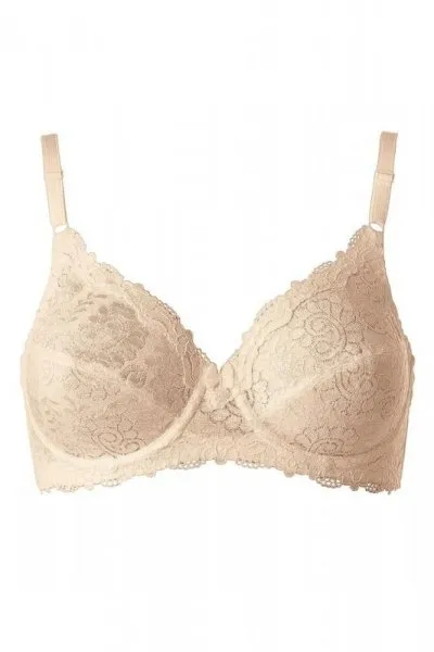Mocno zabudowany biustonosz z miękkimi miseczkami na fiszbinach. Miseczki wykonane w całości z koronki, w dolnej części wzmocnione dodatkową warstwą tiulu. Model dostępny również w większych rozmiarach.Skład: 90% poliamid, 10% elastan…