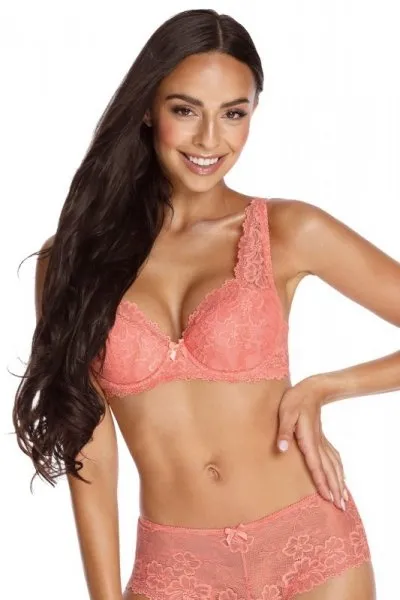 Urokliwy biustonosz typu push-up pięknie unosi piersi. Miseczki pokryte koronką o kwiatowym wzorze. Umieszczona między miseczkami kokardka dodaje biustonoszowi uroku.Miski dwuczęściowe, uszyte z cienkiej pianki gorseciarskiej,Wewnętrzna część miseczek wyściełana bawełną,Wewnątrz miseczek wyjmowane wkładki push-up, umieszczone w specjalnie przeznaczonych do tego kieszonkach,Plecy wykonane z koronki,Odpinane, regulowane ramiączka,Pionowe fiszbiny boczne zapobiegają marszczeniu się boczków…