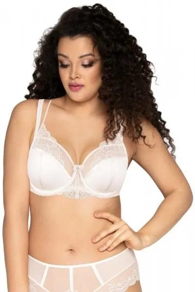 Biustonosz push up z efektownej koronki o kwiatowym motywie, na łączeniu miseczek satynowa kokardka i złoty element biżuteryjny z logo MAT. Miseczki od wewnętrznej strony podszyte beżową bawełną. Boczki z tiulowej siateczki, wzmocnione pionową fiszbiną. Wyjmowane wkładki, odpinane ramiączka z regulacją.Skład: 25% poliamid, 25% poliuretan, 25% poliester, 21% bawełna, 4% elastan…