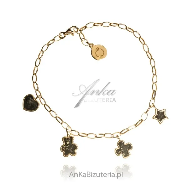 Bransoletka srebrna pozłacana z przywieszkami z zielonego bursztynu