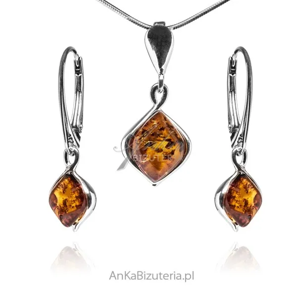 Komplet biżuteria srebrna z bursztynem z rzeźbionymi różami