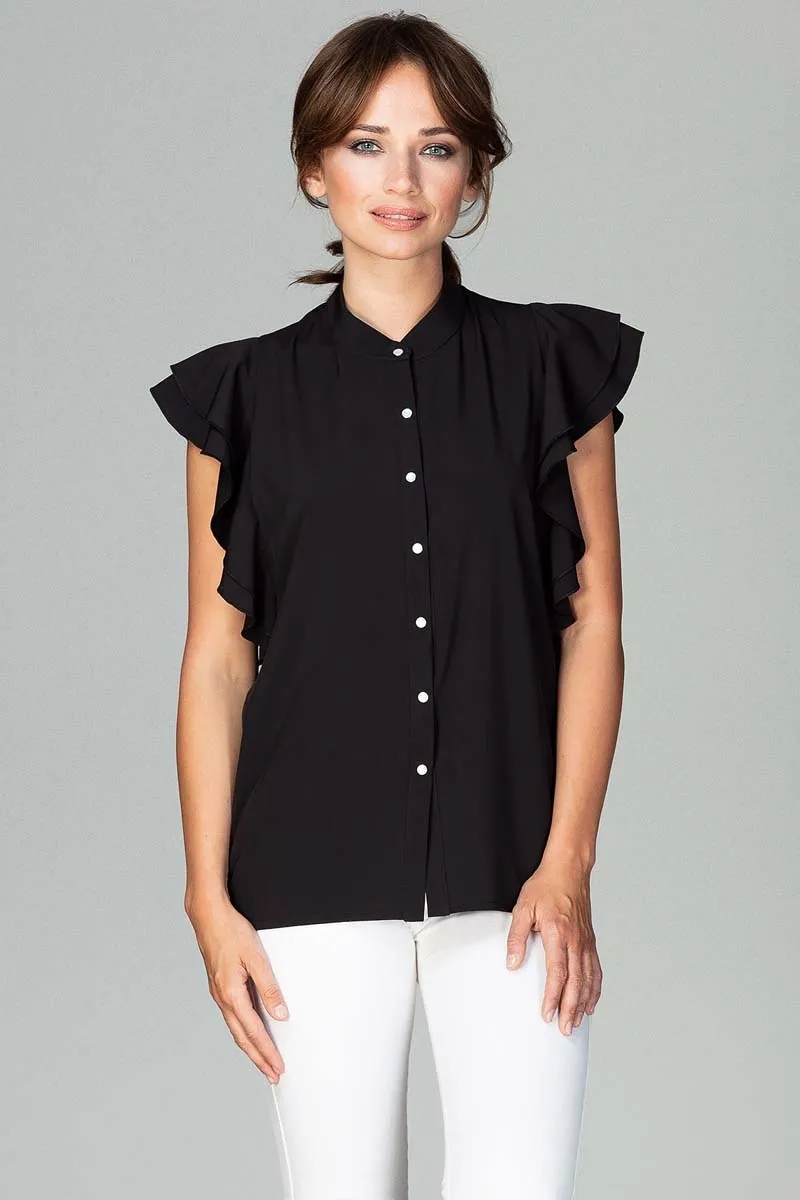 Czarna Koszulowa Bluzka z Falbankowym Rękawem