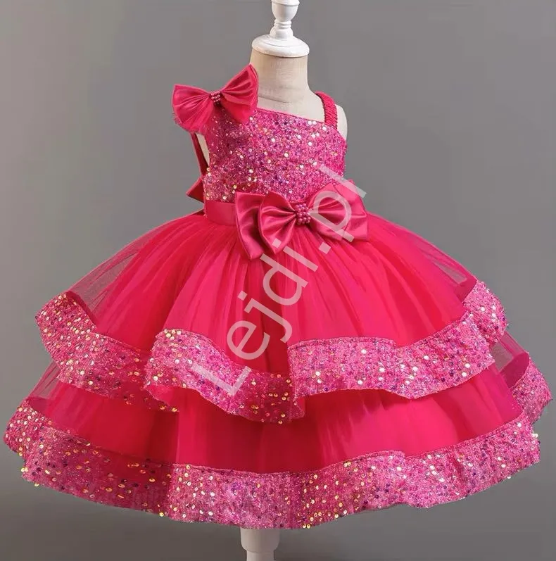 Ciemno różowa tiulowa sukienka wieczorowa dla dziewczynki z cekinami i kokardą 170