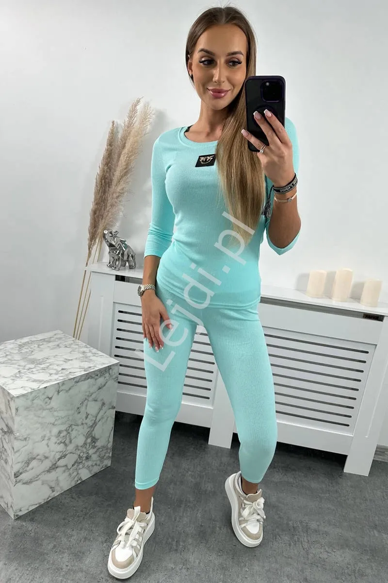 Prążkowany turkusowy komplet sportowy z jaskółką 9436