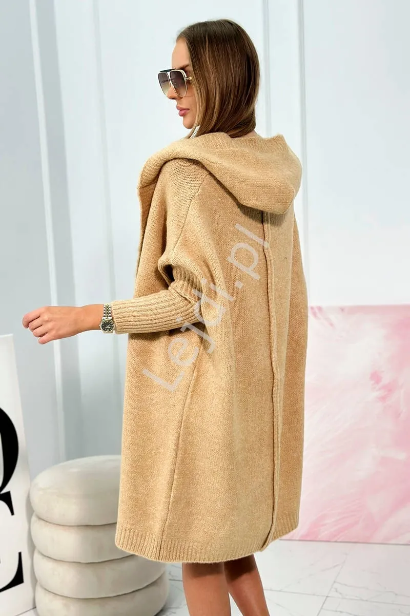 Błękitny sweter długi z kapturem. Długi sweter damski z kapturem i kieszeniami. Modny sweter ala narzutka z kapturem. Nie zapinany sweter w błękitnym kolorze.