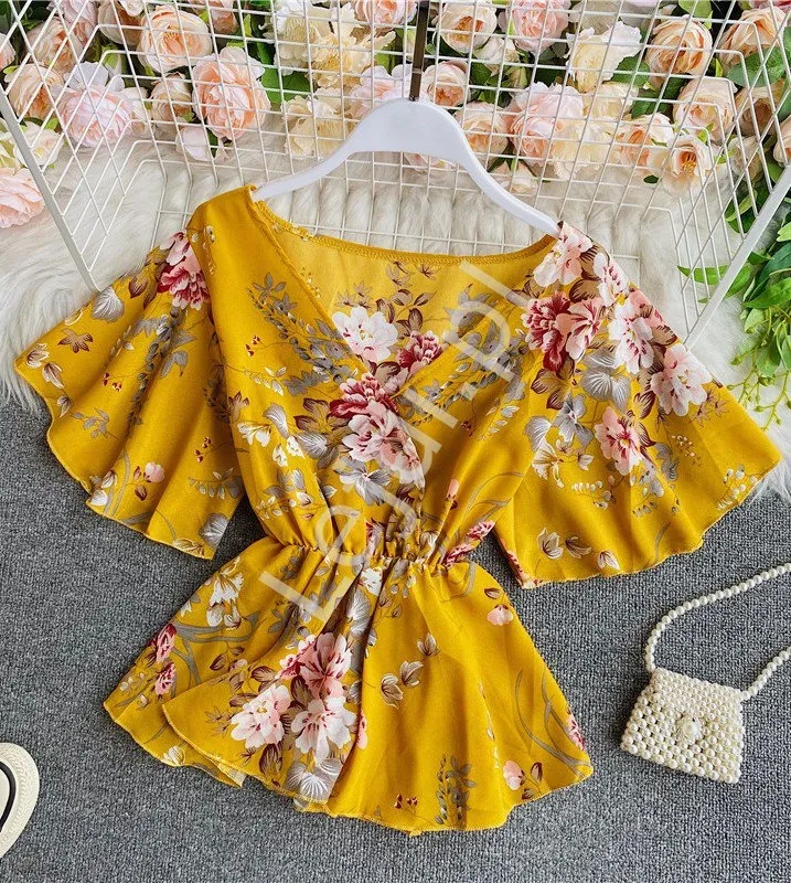 Musztardowa bluzka baskinka w kwiatowy wzór 4164