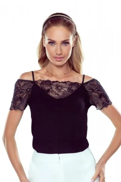 Elegancka bluzka damska- miła wiskoza- linia dekoltu z ażurowej koronki z rozcięciem- krótkie, koronkowe rękawkiSkład:75% wiskoza, 20% poliamid, 5% elastan…