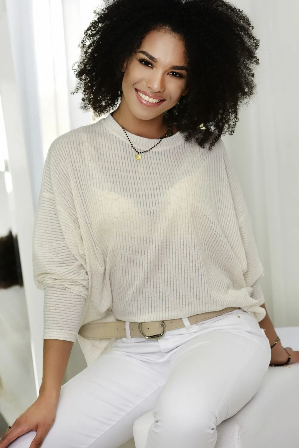 Oversize’owa bluzka w kolorze ecru. Wyróżnia się zwężanymi rękawami o długości 3/4. Na odsłonięte nadgarstki warto włożyć parę bransoletek. Wygodna bluzka to doskonały wybór na co dzień. Połącz ją z prostymi jeansami i modnymi sneakersami. Jest to znakomita opcja dla fanek prostoty i uniwersalności. Bluzka o kroju oversize. Delikatna i miła w dotyku. Skład: 80%Pollester, 15% Lurex, 5% Spandex XS S M L 1/2 BIUST 60 62 64 66 1/2 TALIA 56 58 60 62 1/2 BIODRA 54 56 58 60 RĘKAW 57,5 58 58,5 59 DŁUGOŚĆ 59,5 60 60,5 61