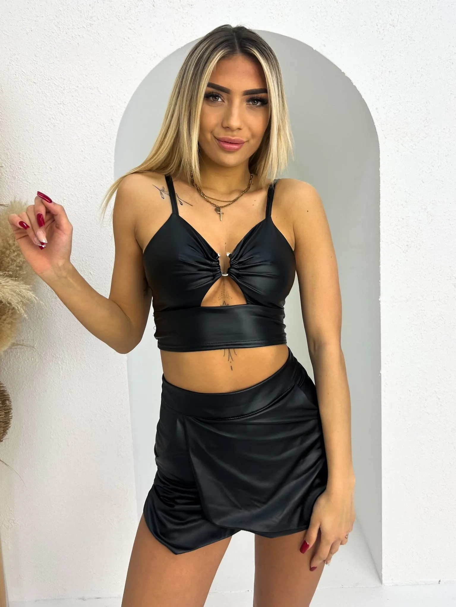 Bluzka polskiej produkcji na ramiączkach z klamrą skórzana czarna Vanesa W1