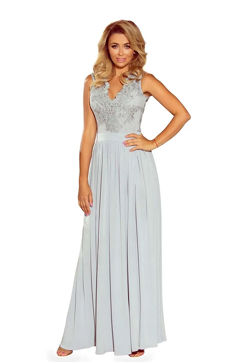 Srebrna Długa Wieczorowa Sukienka z Koronką
