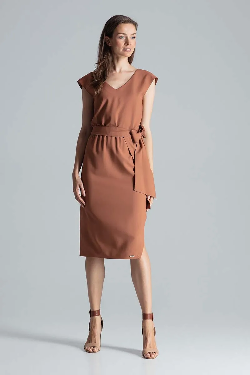 Brązowa Prosta Midi Sukienka z Dekoltem V z Paskiem
