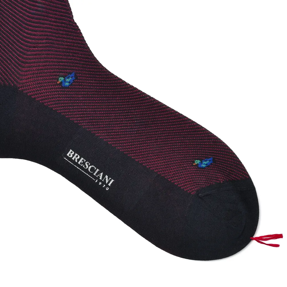 Jedwabne bordowe skarpetki Bresciani for VAN THORN są dla osób, które uwielbiają styl. Najwyższej jakości jedwab i dbałość o najmniejsze detale podczas szycia to gwarancja tego, że jedwabne bordowe skarpety posłużą wiele modowych sezonów. Jedwab jest materiałem oddychającym, miękkim i dającym wysoki komfort noszenia skarpet męskich nawet przez wiele godzin. Skarpety jedwabne bordowe Bresciani for VAN THORN warto założyć do stylizacji o wysokim poziomie formalności. Skarpetki jedwabne bordowe założysz do garnituru, smokingu czy fraka. Skarpety jedwabne bordowe będą idealnym elementem szafy modnego mężczyzny, który lubi dobrze wyglądać w każdej sytuacji. Elementem ozdobnym jedwabnych bordowych skarpet jest prosty prążek przechodzący przez ich środek. elementem ozdobnym jest prosty prążek przechodzący przez środek skarpet. Bresciani for VAN THORN trzymają się dobrze na łydce nie trzeba ich poprawiać podczas noszenia, a jednocześnie są bezuciskowe.