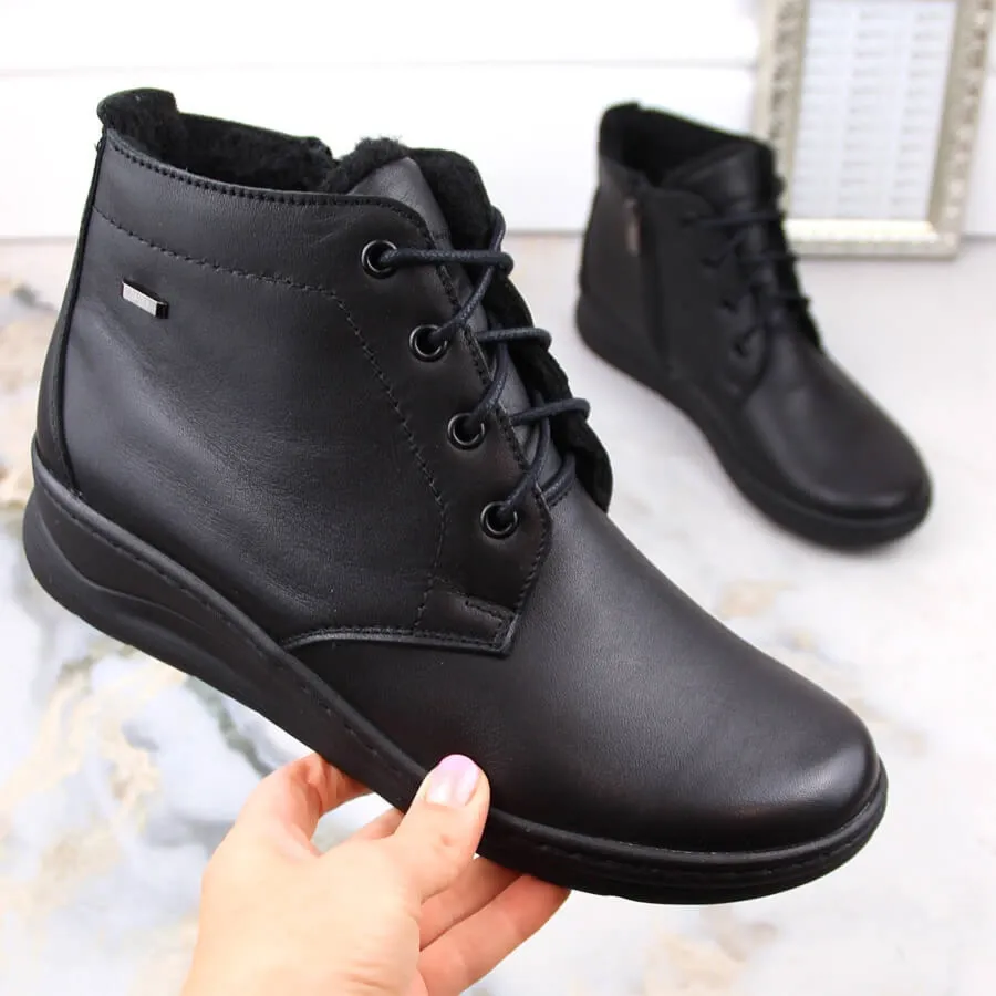 Skórzane komfortowe botki damskie na koturnie zimowe czarne Helios 584