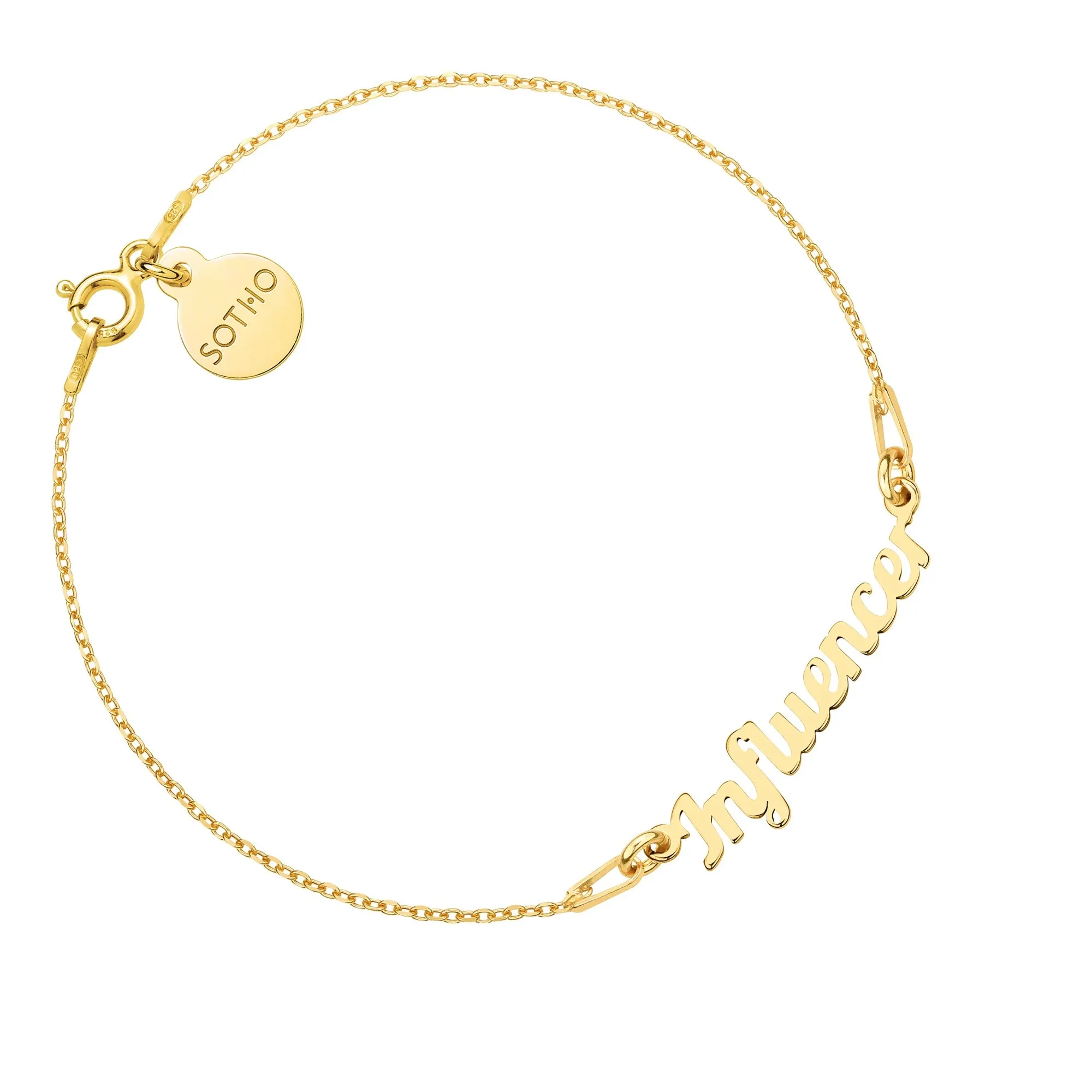 Bransoletka łańcuszkowa z różowego złota zdobiona napisem Influencer i zawieszką z logo marki. Całość wykonana ze srebra 925 powlekanego 24 karatowym różowym złotem. Długość bransoletki ok 18,5 cm. Grubość łańcuszka 1 mm. Napis 31 x 7 mm. Zawieszka z logo 10 mm. Produkt o wadze poniżej 5 g. Zapakowana w eleganckie pudełeczko z logo marki. Posiada logowaną metkę. Istnieje możliwość zamówienia bransoletki innej długości, z innym modelem zawieszki, z kilkoma zawieszkami, na innym modelu łańcuszka, w wersji ze srebra 925 lub srebra 925 powlekanego 24 karatowym żółtym złotem, z dodatkowymi kamieniami, perłami lub kryształami SWAROVSKI® CRYSTAL itp.