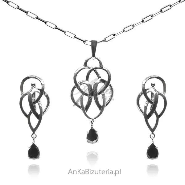 Komplet biżuteria srebrna z czarną cyrkonią węzeł irlandzki