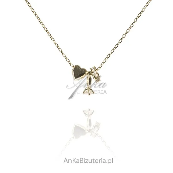 Subtelny naszyjnik pozłacany dla ukochanej - przywieszki: serduszko, obrączka i pierścionek zaręczynowy