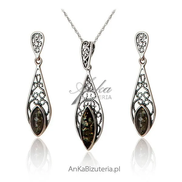 Komplet biżuterii srebrnej z zielonym bursztynem