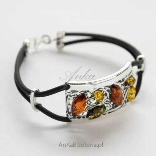 Bransoletka srebrna z kolorowym bursztynem na kauczuku