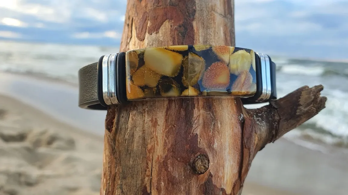Bransoletka męska ze skóry i bursztynu - mozaika- unisex