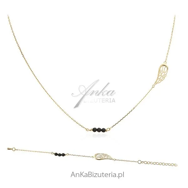 Naszyjnik srebrny pozłacany skrzydełko z czarnymi onyksami
