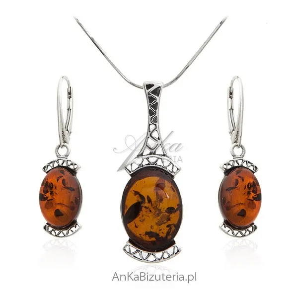 Biżuteria z bursztynem - komplet biżuterii srebrnej z bursztynem - wieża eiffla