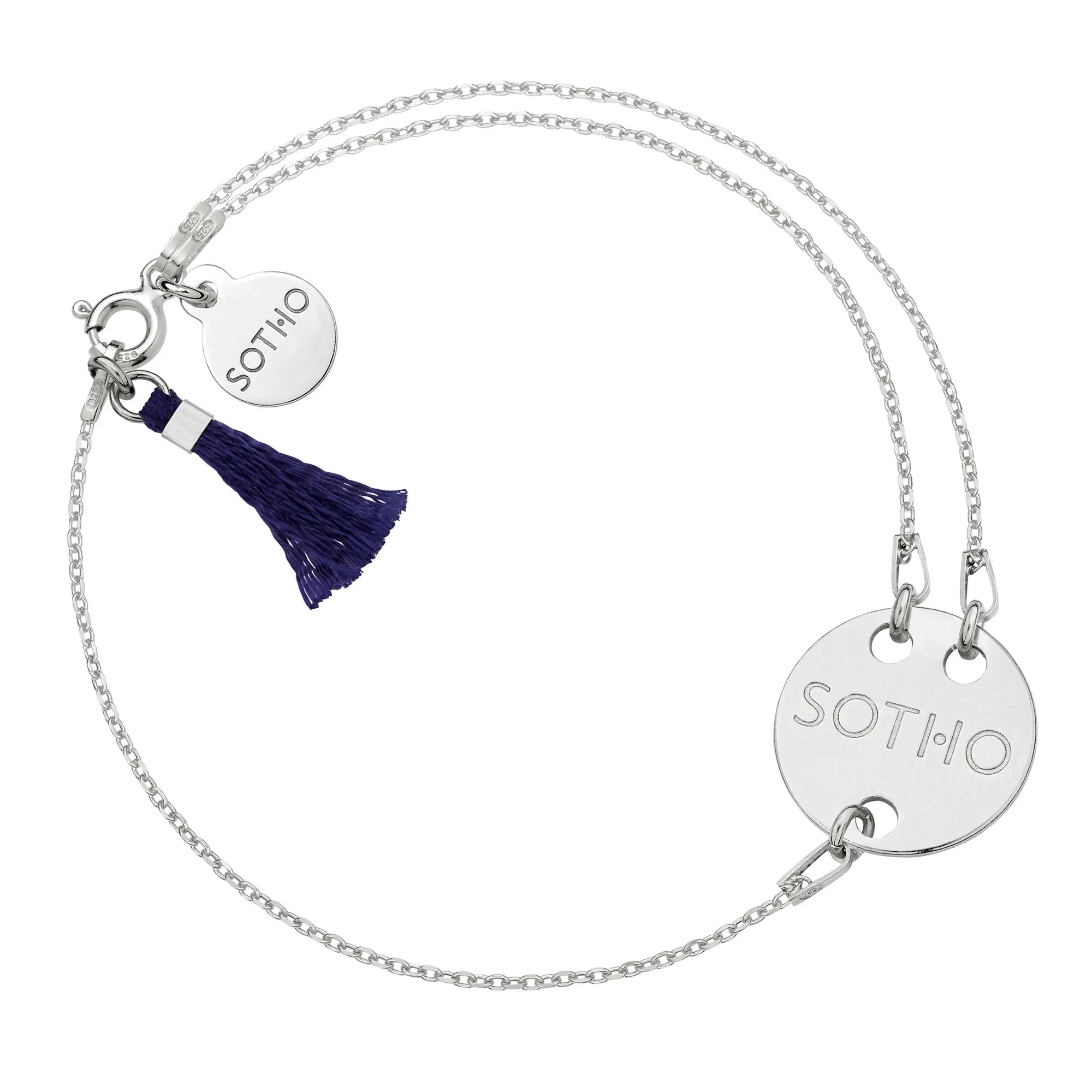 Złota łańcuszkowa asymetryczna bransoletka zdobiona okrągłą zawieszką z logo marki i granatowym chwostem. Całość wykonana ze srebra 925 powlekanego 24 karatowym różowym złotem.