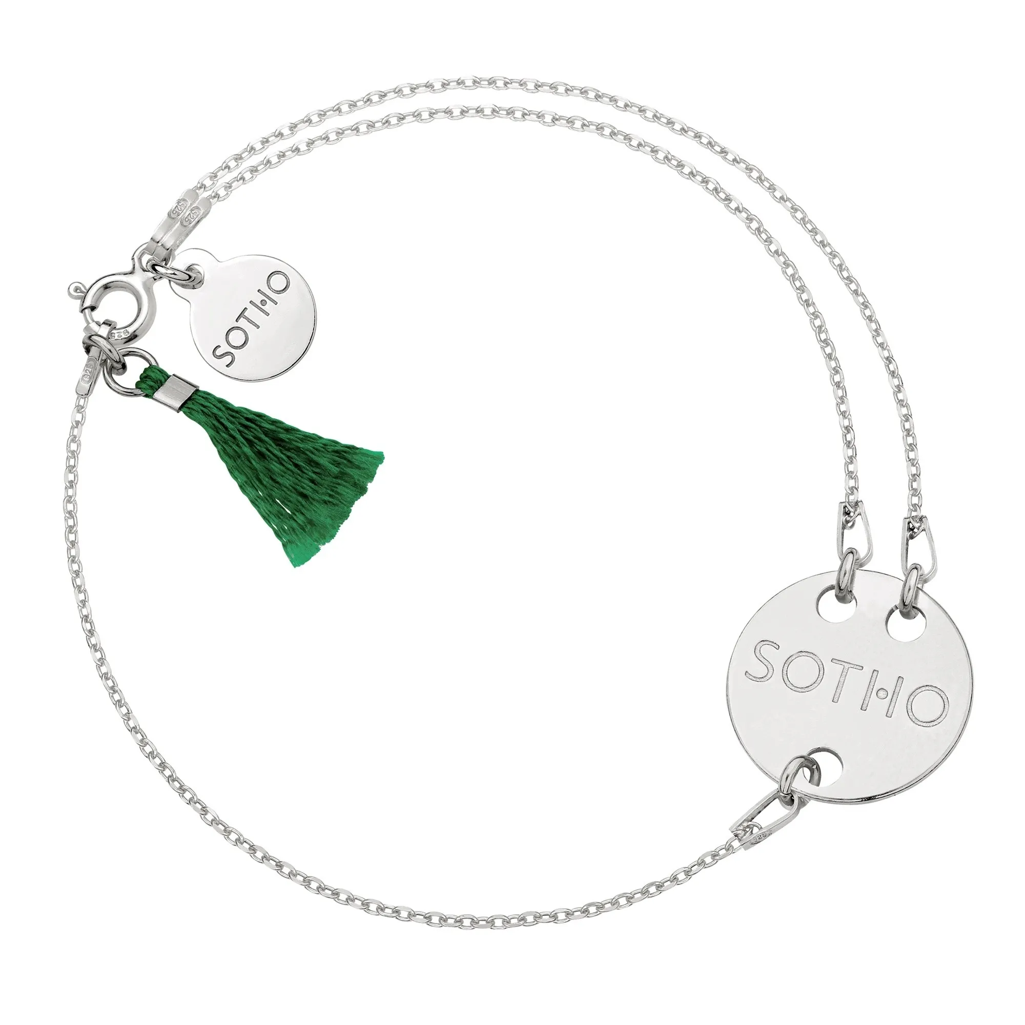 Złota łańcuszkowa asymetryczna bransoletka zdobiona okrągłą zawieszką z logo marki i zielonym chwostem. Całość wykonana ze srebra 925 powlekanego 24 karatowym różowym złotem.