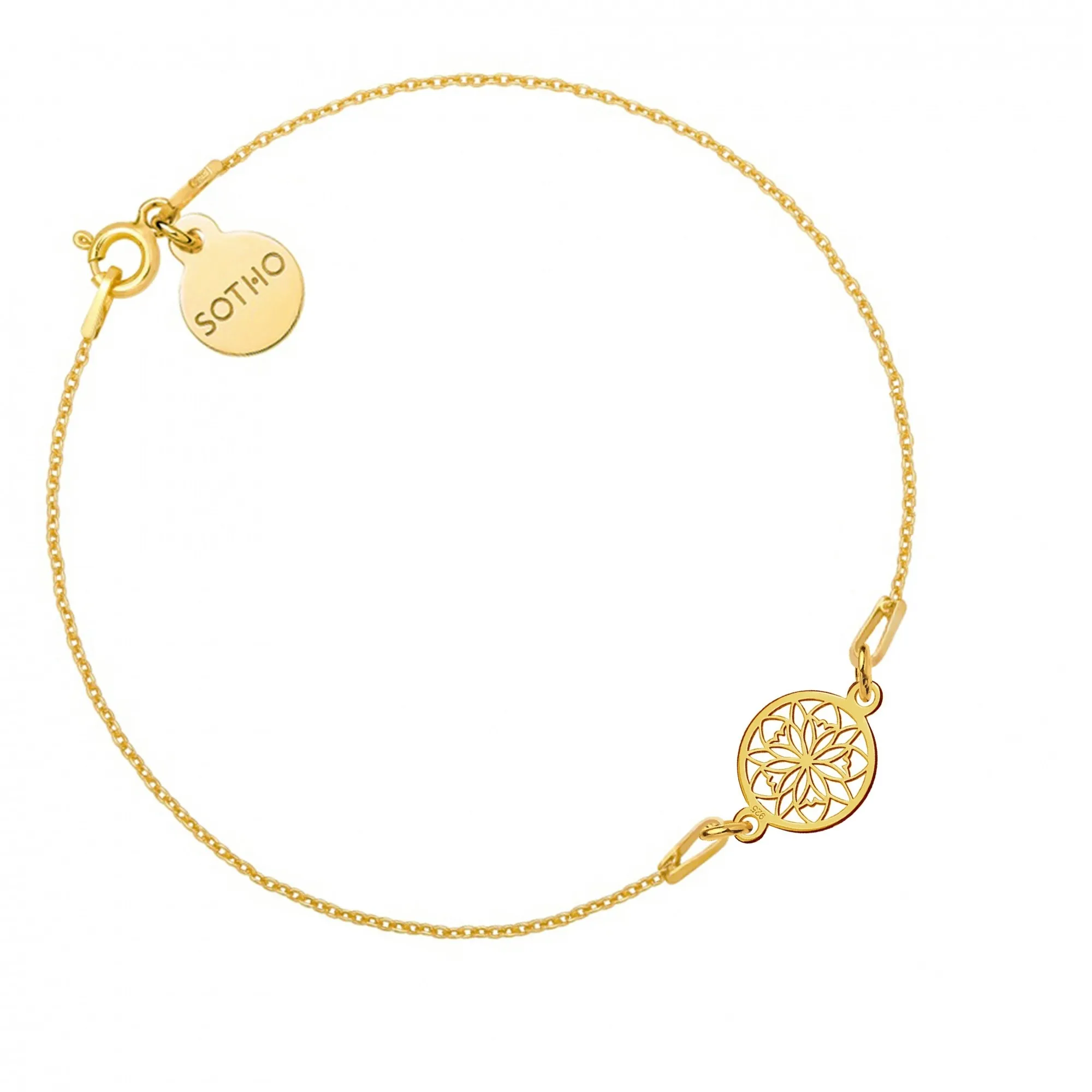 Złota bransoletka łańcuszkowa zdobiona ażurową rozetką i zawieszką z logo marki. Całość wykonana ze srebra 925 powlekanego 24 karatowym różowym złotem. Długość bransoletki ok. 17 cm. Grubość łańcuszka 1 mm. Rozeta 12 mm. Zawieszka z logo 10 mm. Produkt o wadze poniżej 5 g. Zapakowana w eleganckie pudełeczko z logo marki. Posiada logowaną metkę. Istnieje możliwość zamówienia bransoletki innej długości, z innym modelem zawieszki, z kilkoma zawieszkami, na innym modelu łańcuszka, w wersji ze srebra 925 lub srebra 925 powlekanego 24 karatowym żółtym złotem, z dodatkowymi kamieniami, perłami lub kryształami SWAROVSKI® CRYSTAL itp.