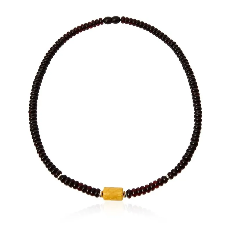 Naszyjnik srebrny z bursztynem - wiśniowe wałki i żółty walec „amber duo balance”