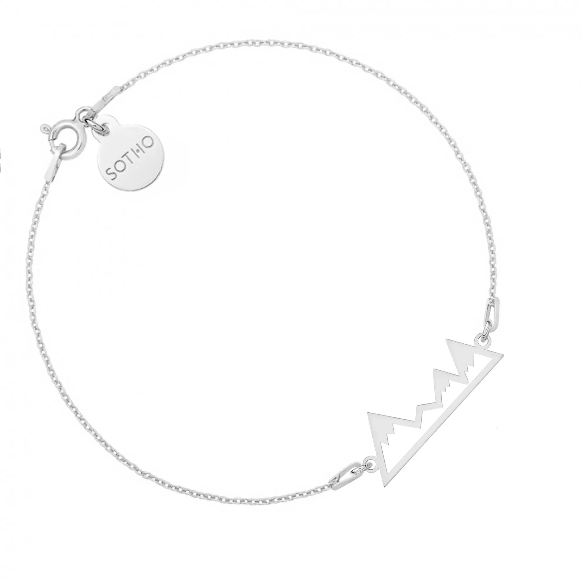Złota bransoletka łańcuszkowa zdobiona górami i zawieszką z logo marki. Całość wykonana ze srebra 925 powlekanego 24 karatowym różowym złotem.