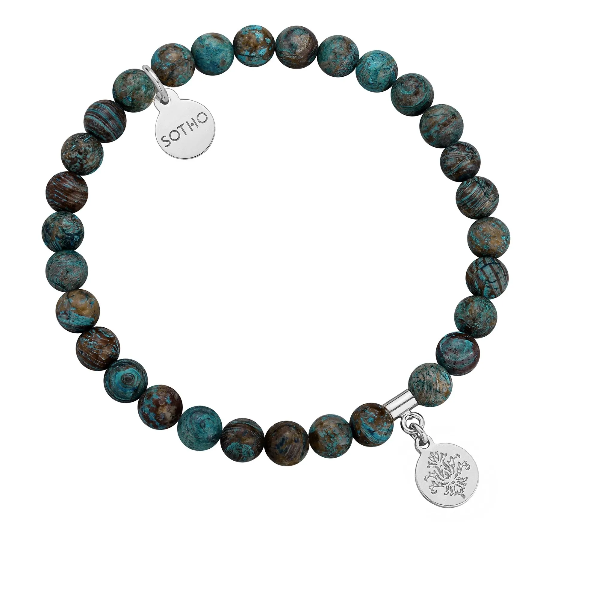 Bransoletka wykonana z turkusowo-brązowego jaspisu, ażurowej rozetki i zawieszki z logo marki. Wszystkie elementy wykonane ze srebra 925 powlekanego 24 karatowym różowym złotem.