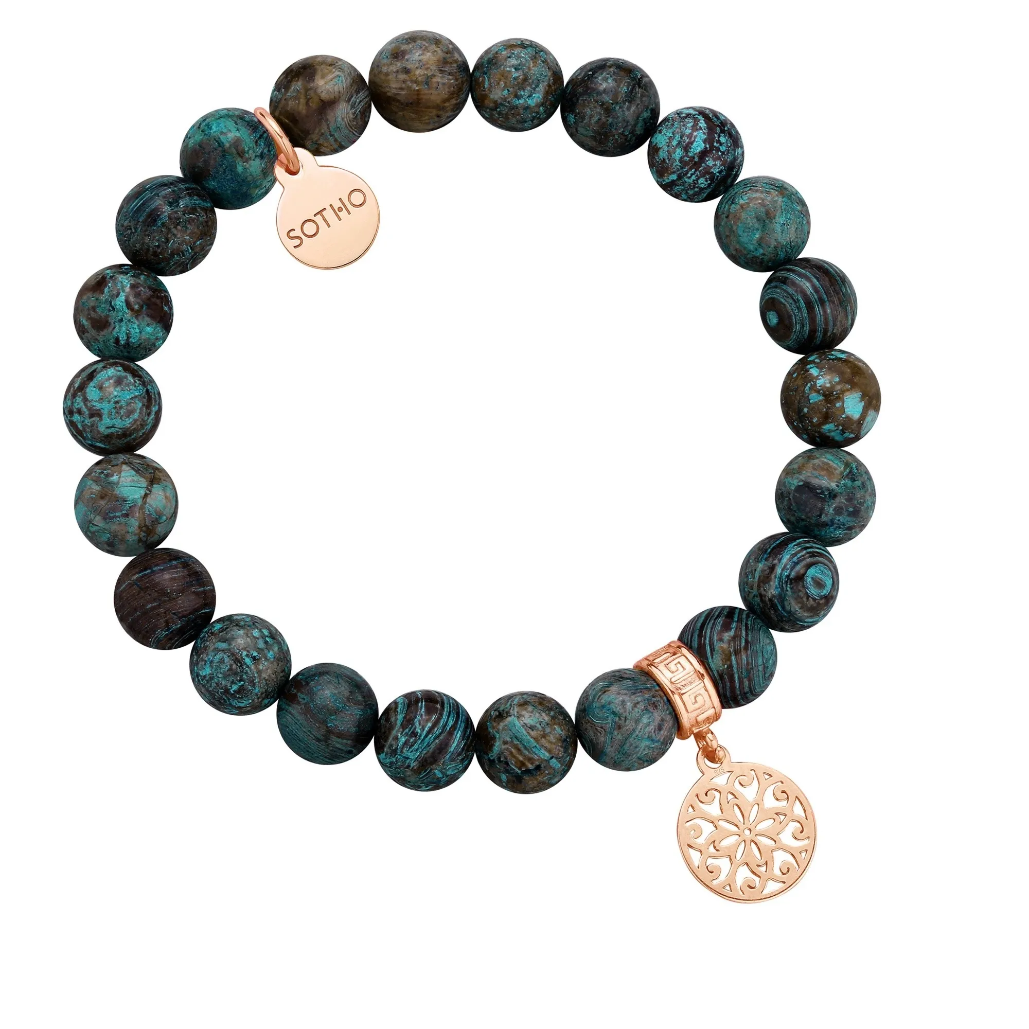 Bransoletka wykonana z turkusowo-brązowego jaspisu, ażurowej rozetki i zawieszki z logo marki. Wszystkie elementy wykonane ze srebra 925.